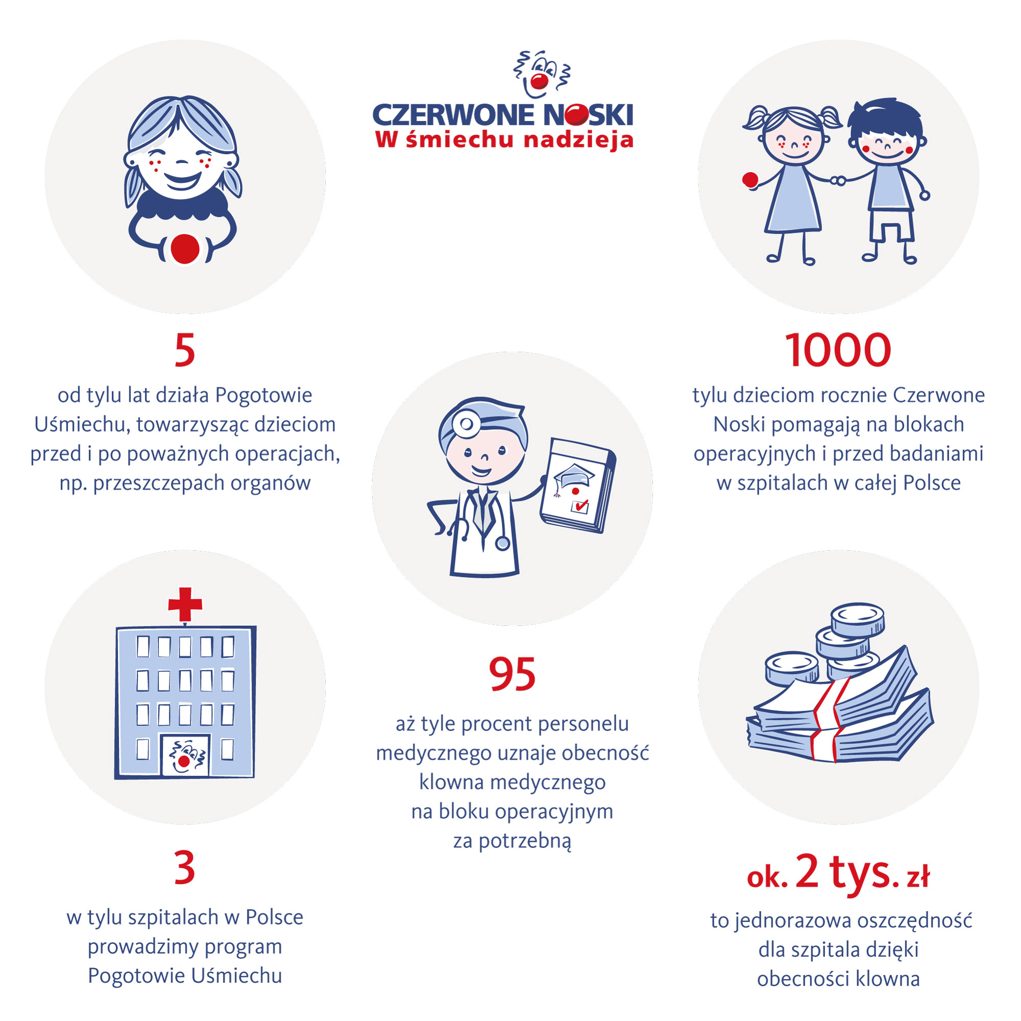 Od stycznia tego roku klowni medyczni Czerwonych Nosków towarzyszą dzieciom na bloku operacyjnym Uniwersyteckiego Szpitala Dziecięcego w Krakowie. Wchodzą nawet za tzw. czerwoną linię na bloku operacyjnym, czyli tam, gdzie nie może wejść nawet rodzic. Taki program nazywa się Pogotowie Uśmiechu. Czerwone Noski prowadzą go już w Poznaniu, Wrocławiu i Warszawie. W Krakowie klowni z „Pogotowia Uśmiechu” pomagają także przy badaniach rezonansem magnetycznym.
